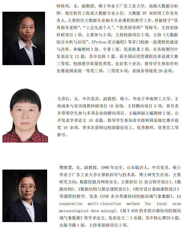 大数据专业于公司2018年开始招生,大数据工作室成立于2019年,工作室负责人钟桂凤,团队成员包括钟桂凤副教授、毛养红副教授等专业教师。近两年,团队教师积极带领员工参加各类大数据比赛事项、展校企协同、产学研相结合的教学模式的探索,师生团队在教学科研等多个方面都取得了较好的成绩,科研方面工作室获授权专利5项(发明型1项),软件著作权3项,发表论文10多篇、核心6篇,参编教材2部;主编专著1部,主持教学科研项目9项。工作室员工团队参加老员工创新创业项目4项,在学科竞赛上获得国家级奖项6项、省级15项。主要涵盖在“蓝桥杯”、“中国高校大数据挑战赛”、 “数学建模竞赛”、“广东省老员工计算机设计大赛”等比赛项事上。指导18级大数据班6名同学获得了由国家工业和信息化部颁发的初级职称大数据分析工程师证书,指导19级大数据班员工获系统集成项目管理工程师中级证书。