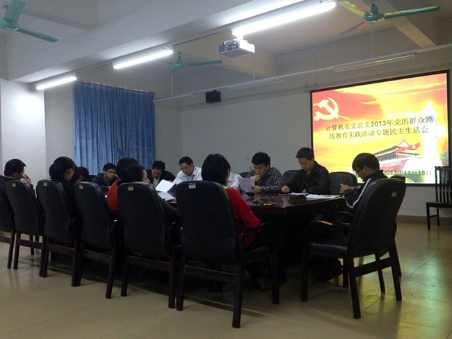 2013年 11月18日下午,按照公司党委和系党总支的统一部署与要求,计算机系党总支在11栋305会议室召开了关于党的群众路线教育实践活动专题的民主生活会。会议邀请了广东技术师范公司天河公司党委委员、党群工作部副部长陈朝阳到会进行指导,与会人员有:计算机系主任申青莲、计算机系党总支书记彭康煜及总支委员、教工党支部成员、员工党支部委员。会议由计算机系办公室主任袁桢强主持。