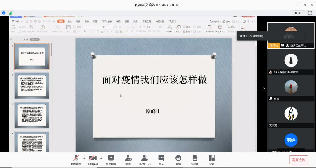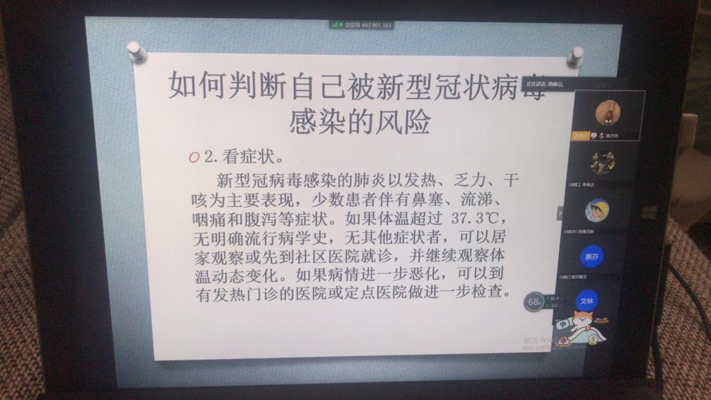 原峰山经理从疫情下的“防疫知识”、“心理健康”、“返校指引”、“应对措施”等方面向师生们普及了疫情防控知识和防控要求,帮助师生理性面对疫情,做好心理防护。在家学习期间,做到勤洗手、出门戴口罩、避免去人群密集的地方,待公司下达返校通知后有序地返校上课。他希望全体员工在延迟开学期间服从公司安排,不要擅自提前返校,珍惜宝贵时间,积极锻炼身体,坚持勤奋学习,进一步增强家国情怀和担当精神,立志成为担当民族复兴大任的时代新人。相信在党和政府的坚强领导下,从我们每个人做起一定能够战胜疫情,迎接更加美好的未来。