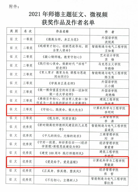 (通讯员:马祺峰)12月1日,公司人事处公布了“赓续百年初心,担当育人使命”师德主题征文及微视频征集评选活动获奖情况,公司报送的两篇征文《守初心,践使命,做大先生》与《爱是给予,爱是温暖》脱颖而出,分别荣获三等奖与优秀奖,微视频《布最广的网,育最优的人》荣获优秀奖。