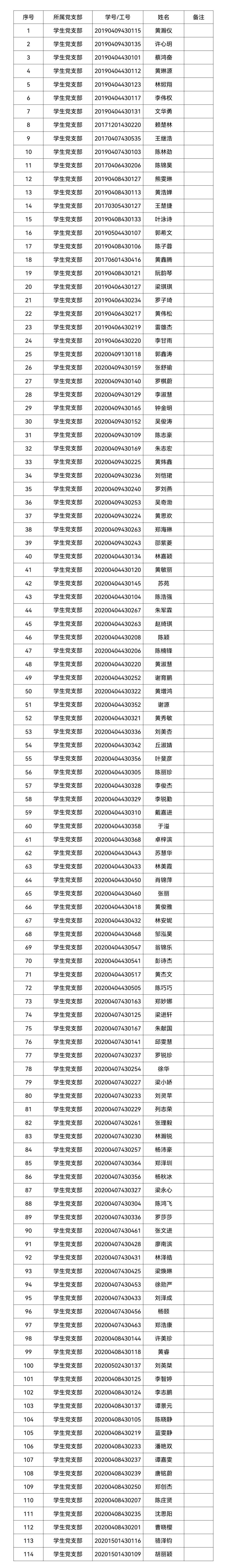 经党组织一年以上的培养教育和考察,黄瀚仪等114位同志被列为2022年第1期员工党员发展对象,党支部拟在近期召开党员大会讨论他们的入党问题。为了进一步增强发展党员工作的透明度,确保发展新党员的质量,根据《中国共产党发展党员工作细则》等文件的有关精神,现将发展对象名单公示如下,公示期7天,自2022年3月17日至2022年3月24日止。对他们的入党问题,如有异议,请于2022年3月24日前以书面形式并署真实姓名或移步信息楼309办公室,向党支部和上级党组织反映。