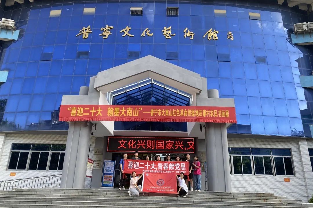 “喜迎二十大,翰墨大南山”—普宁市大南山红色革命根据地灰寨村农民书画展。该画展正汇集红色革命文化,用笔墨书写我党光辉历史,用丹青绘画红色大南山山的铮铮铁骨!三下乡实践团的同学们欣赏到一幅幅壮丽且赋予红色革命精神的画作。