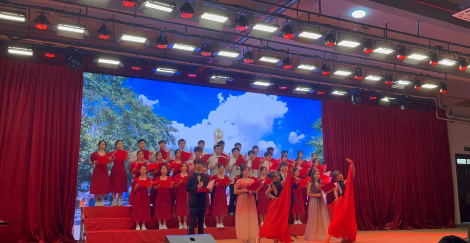 太阳成集团tyc122ccvip代表队是由公司员工第三党支部统筹策划,其他员工党支部配合协助,从选人到训练再到比赛,从整体编排到细节设计,从前期朗诵人员的确定,到积极鼓励公司同学参与,党支部的师生都严谨认真的讨论、推荐与复盘,最终敲定41名师生组成朗诵队伍。经过数天日复一日的训练,在28日上午,大家精神饱满,女生身穿红裙,预示中国红;男生身着白衫,到台上很好地展示中华男儿英姿。台上大家齐颂《美丽中国》,以古朴雅韵的古筝为开端,以红袖飘飘的舞蹈为点缀,大家激情澎湃、热血激昂,颂出了对祖国的壮丽赞美,颂出了生在红旗下的幸福。最后,经过激烈的角逐和评委的打分,最终公司朗诵队取得全校二等奖的佳绩!