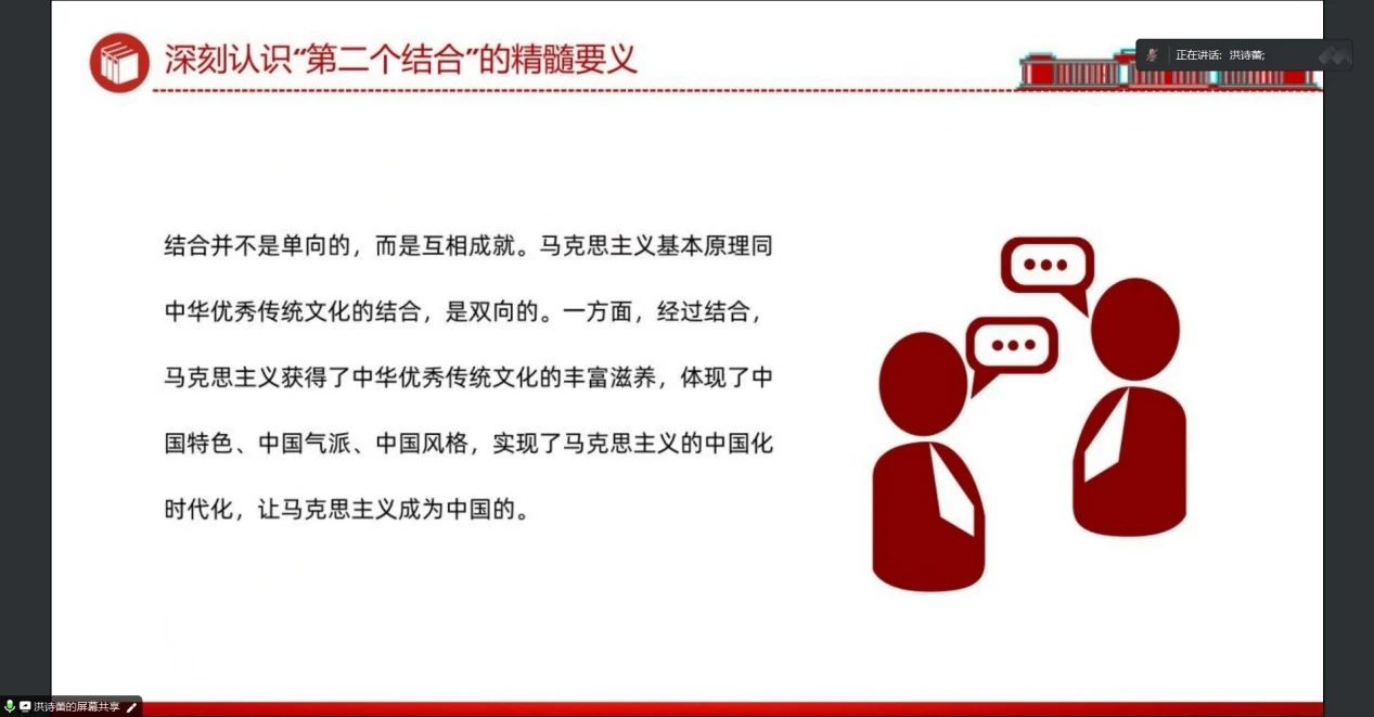 会上,员工第三党支部青年委员洪诗蕾同志带领党员同志从“两个结合”的精髓要义、筑牢中国特色社会主义道路根基、打开广阔的创新空间和巩固文化主体性四个方面展开学习。通过学习,同志们对习近平新时代中国特色社会主义思想与“两个结合”的运用有了初步的了解,并且结合自身的实践经历,更好地对理论学习有了深入的体会。