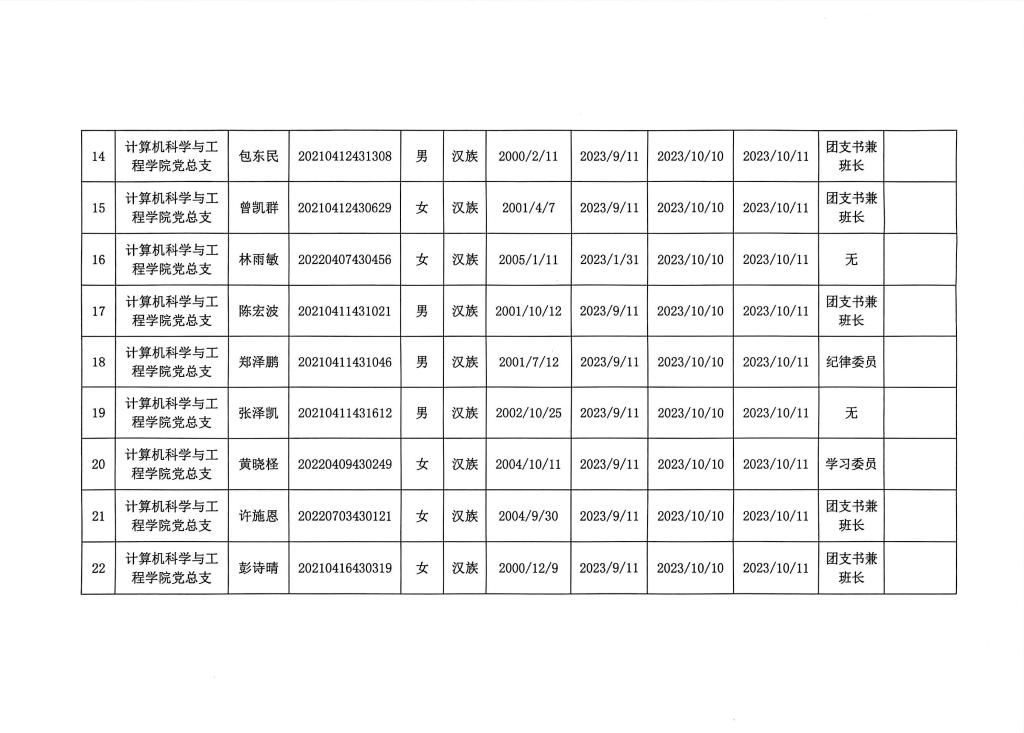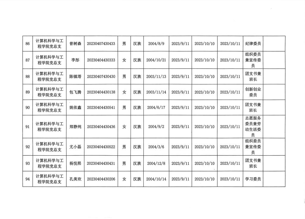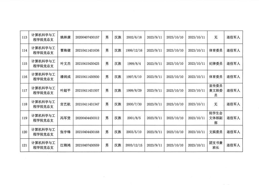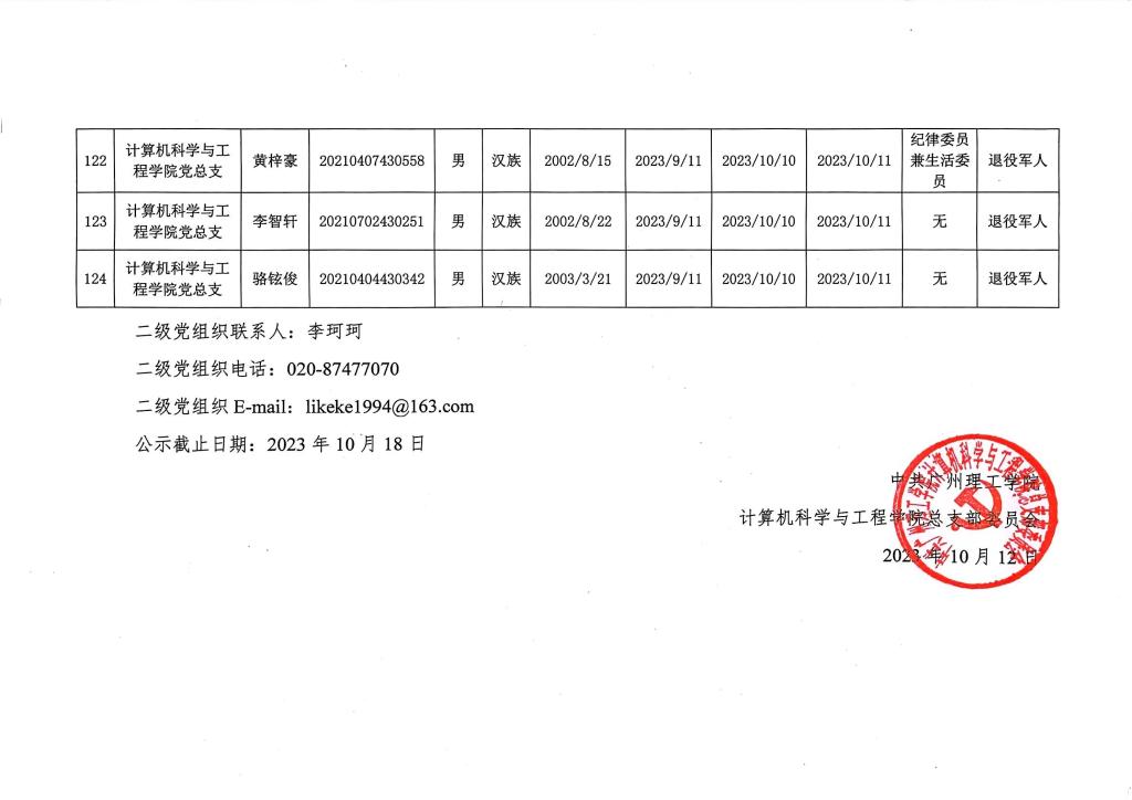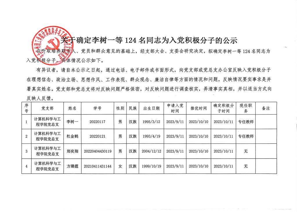 在听取培养联系人、党员和群众意见的基础上,经支部大会、支委会研究决定,拟确定李树一等124名同志为入党积极分子,具体情况公示如下图。如有异议者,请自本公示之日起,通过电话、电子邮件或书面形式,向党支部或党总支办公室反映入党积极分子在理想信念、政治立场、思想作风、工作表现、群众观念、廉洁自律等方面的情况和问题,反映情况要实事求是并署真实姓名。党支部和党总支将对反映问题严格保密,对反映问题进行调查核实,弄清事实真相,并以适当方式向反映人反馈。