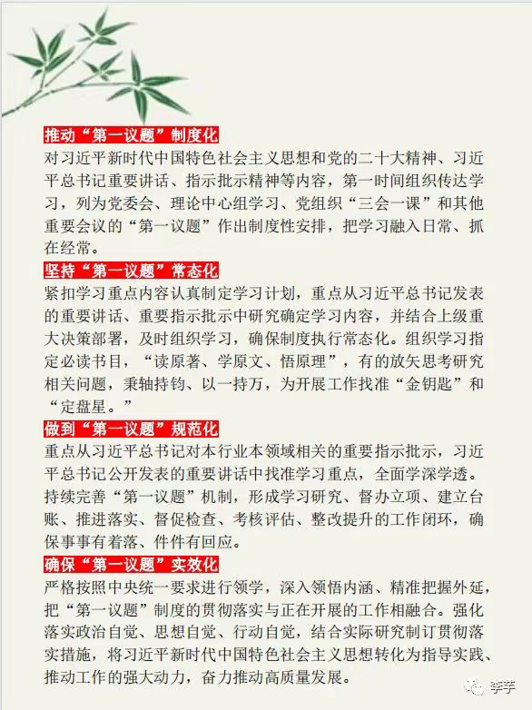 “第一议题”制度,就是聚焦政治建设这个党的根本属性,各级党组织必须把学习习近平新时代中国特色社会主义思想和党的会议精神、习近平总书记重要讲话精神等内容,作为党委会、理论学习中心组学习、支部大会、支委会、党小组会及其他党内重要会议的“第一议题”,第一时间组织传达学习。