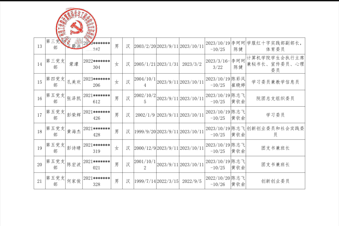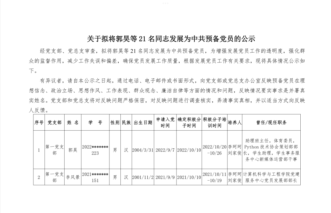 在听取培养联系人、党员和群众意见的基础上,经支部大会、支委会研究决定,拟定郭昊等21名同志为预备党员,具体情况公示如下。