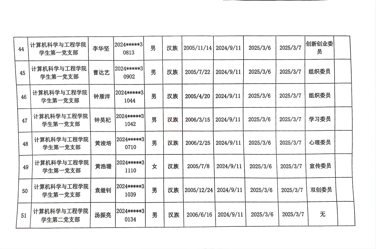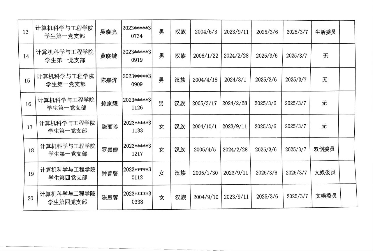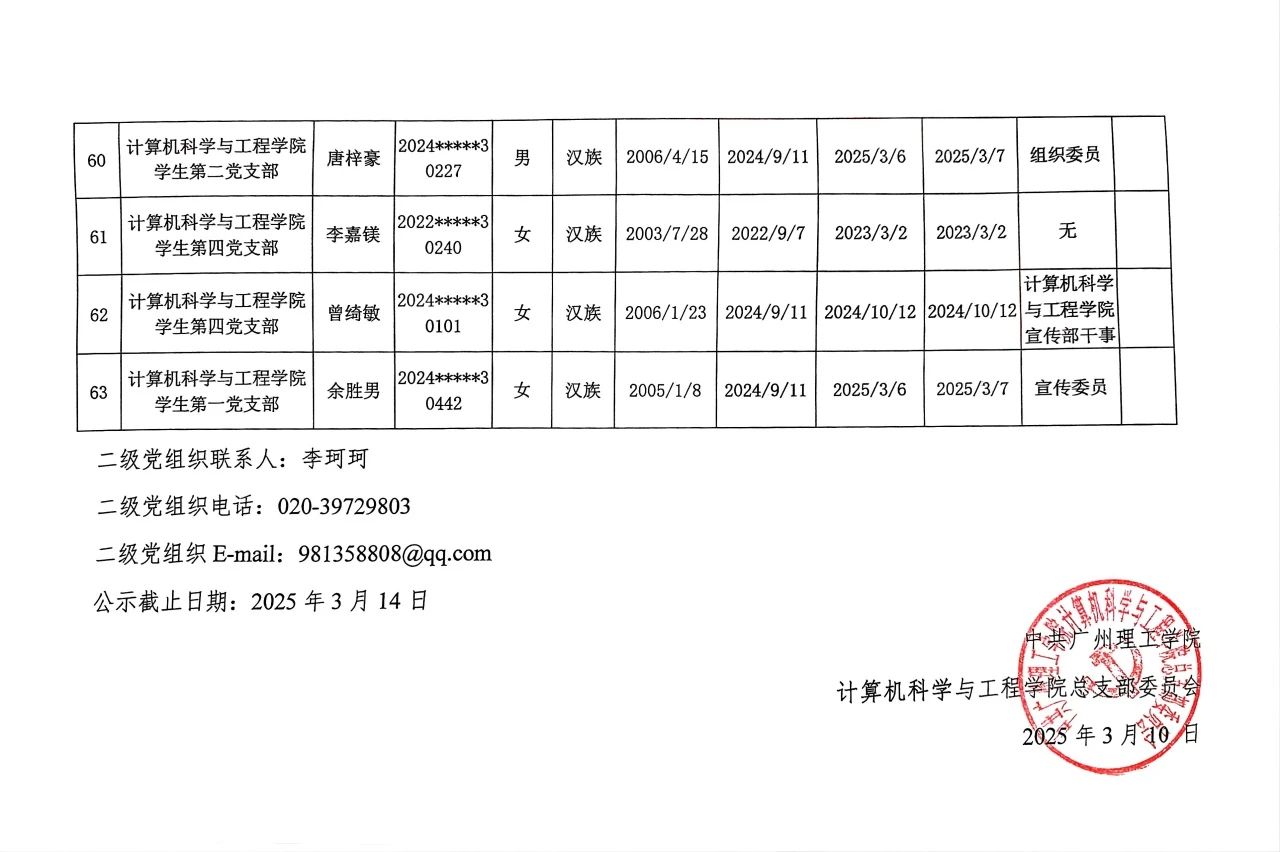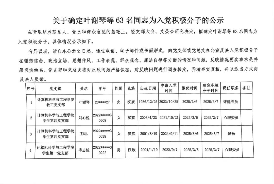在听取培养联系人、党员和群众意见的基础上,经支部大会、支委会研究决定,拟定叶谢琴等63名同志为入党积极分子,具体情况公示如下。