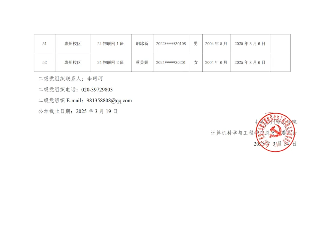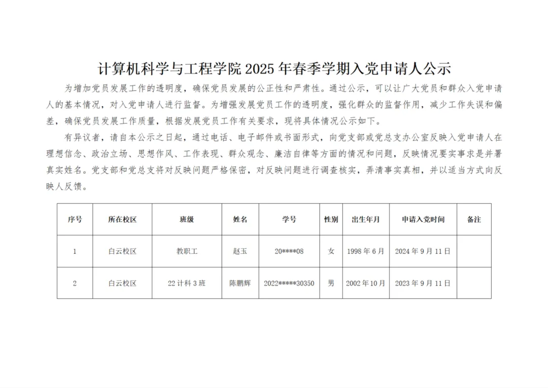 根据关于发展党员工作的相关要求,为了提升发展党员工作的透明度,加强群众监督效能,保证党员发展工作的严谨性和质量,同时让党员和群众对入党申请人的基本状况有所了解,并对其进行有效监督,现将入党申请人的具体情况予以公示如下。