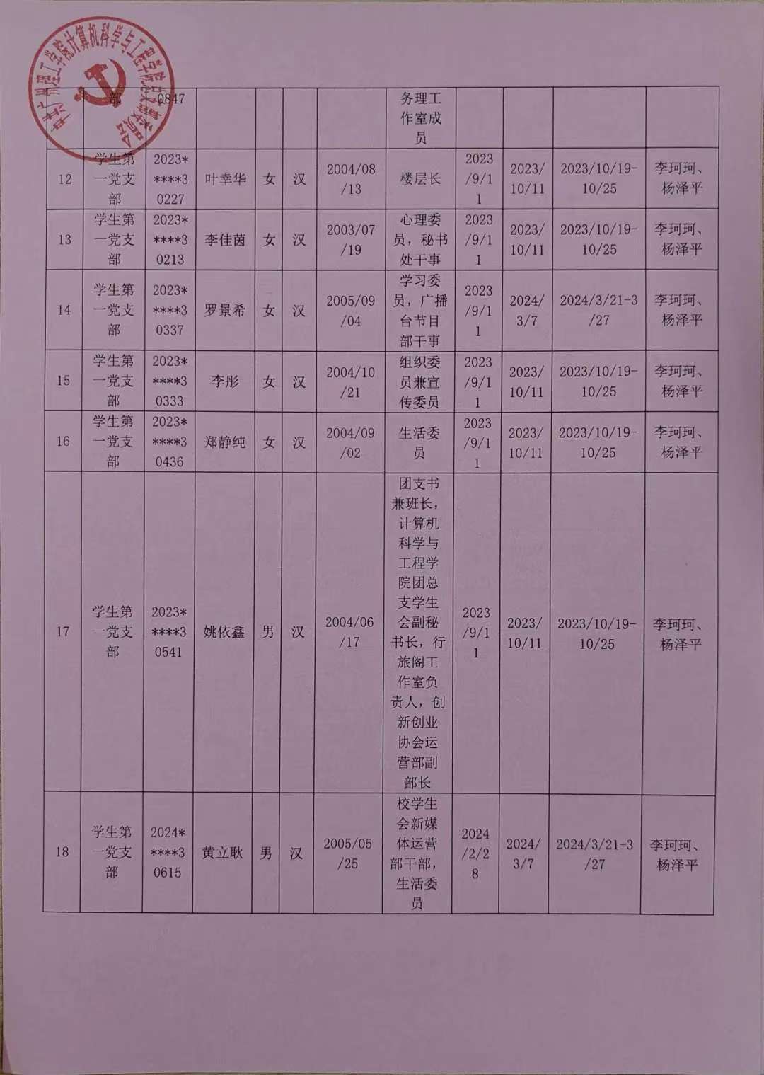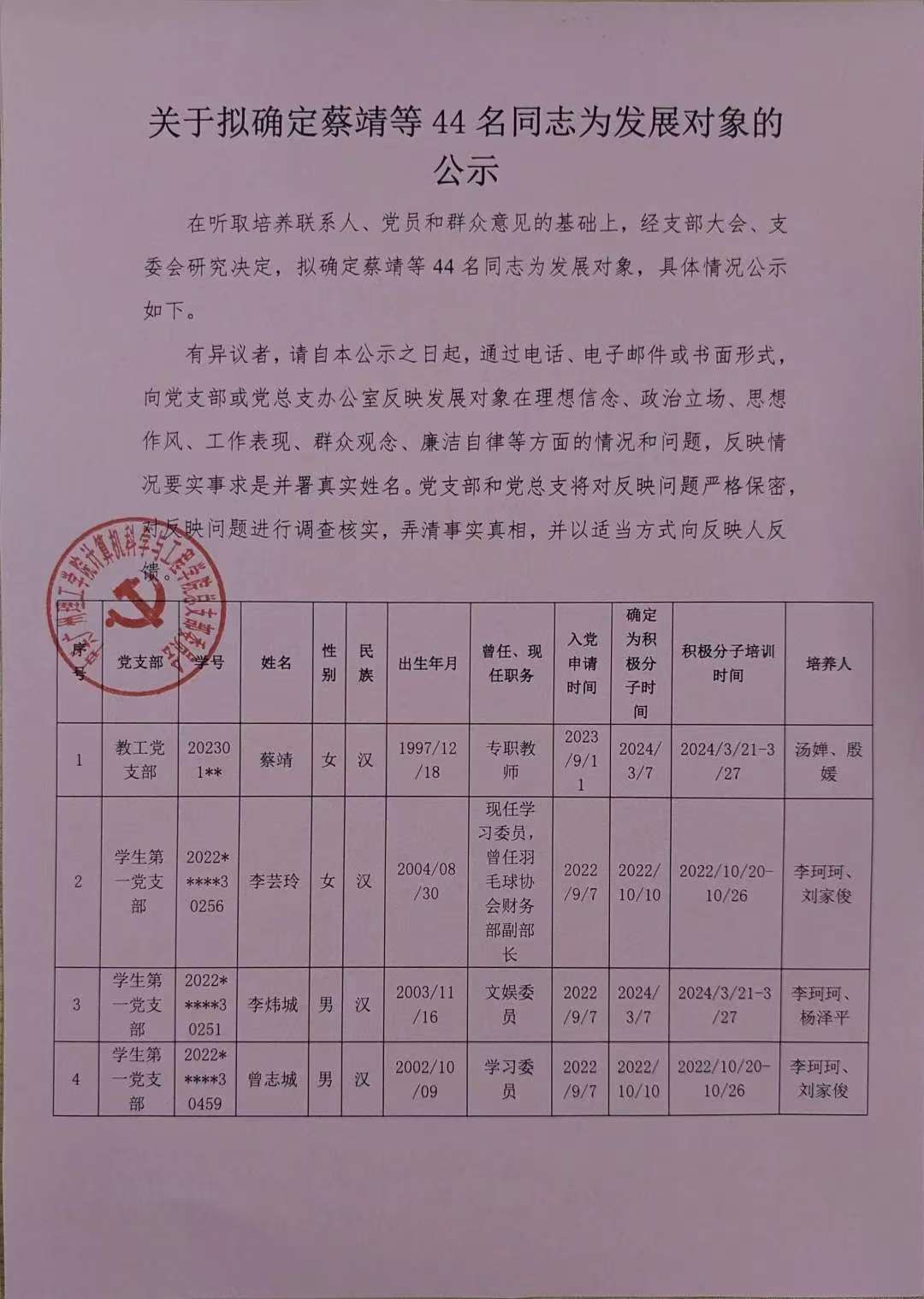 在听取培养联系人、党员和群众意见的基础上,经支部大会、支委会研究决定,拟确定蔡靖等44名同志为发展对象,具体情况公示如下。