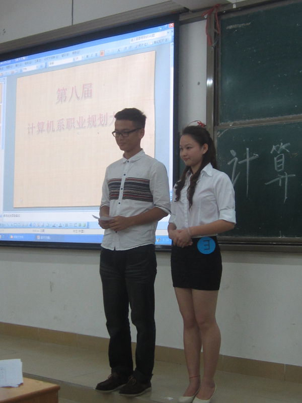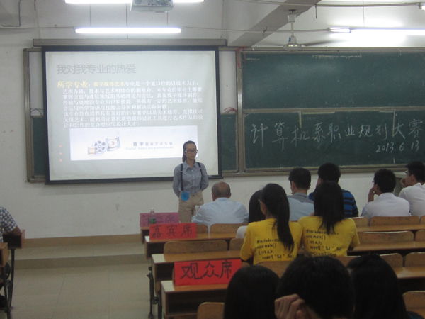 比赛流程主要分两个环节:第一环节是5分钟的个人职业生涯规划展示(ppt展示),第二环节则是选手对评委的答疑时间。经过激烈的角逐,影视121班的凃倩倩以其自信的表现和大方的谈吐夺得冠军,并由刘元俊书记亲手颁奖,合影留念。她将代表计算机系参加院里的总决赛。