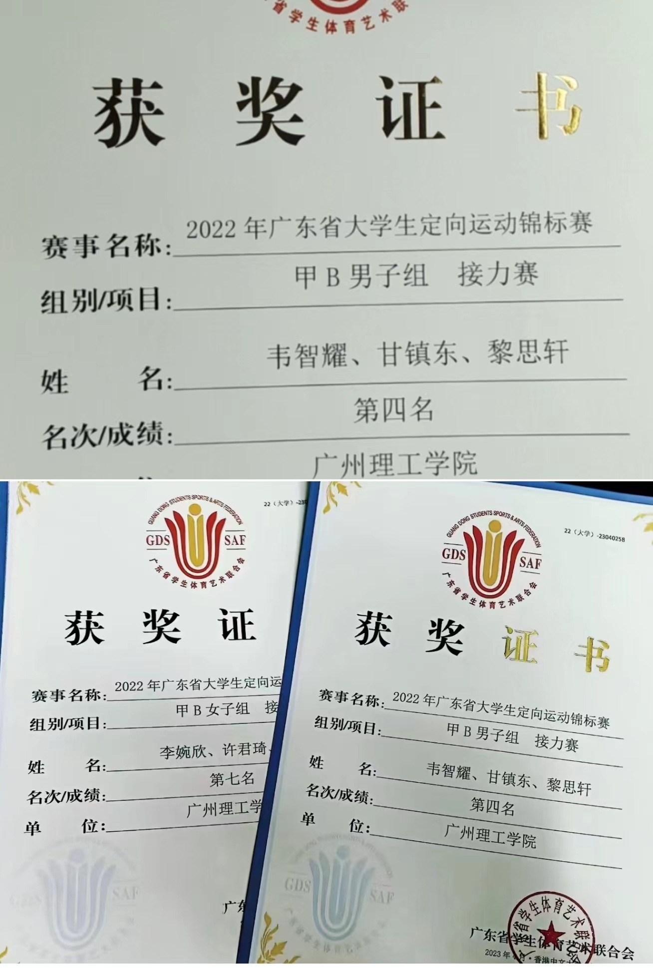 一、甲B男子组接力赛第四名:22计科9班甘镇东、智能制造与电气工程20电气6班韦智耀、工商管理公司22电商2班黎思轩。