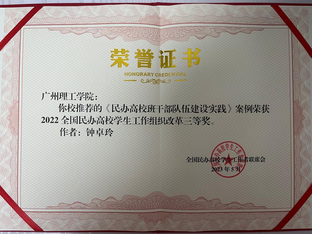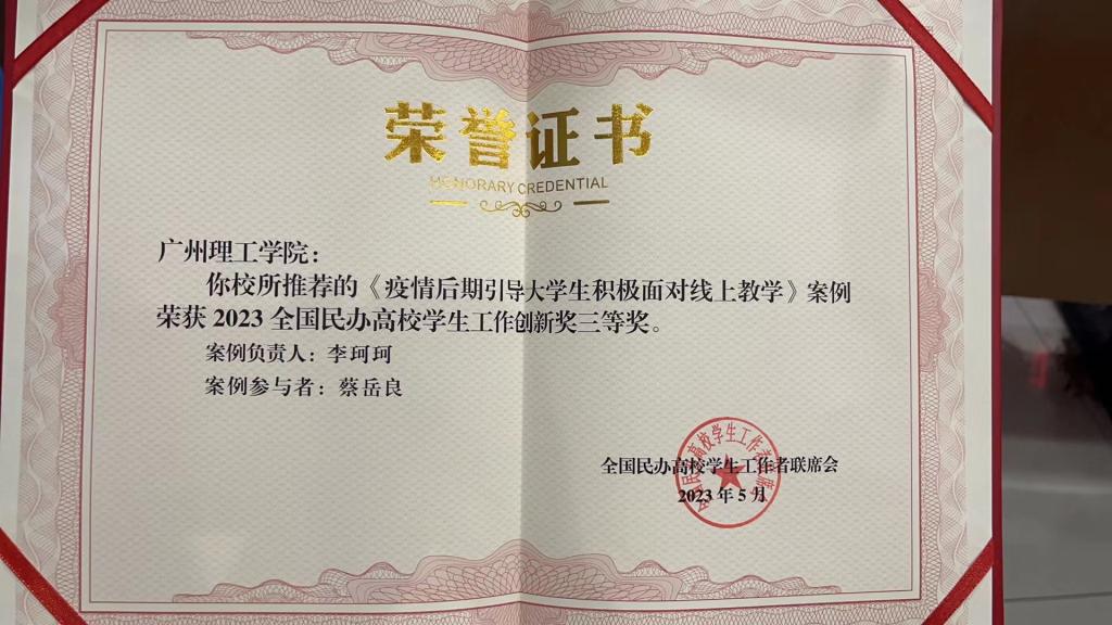 太阳成集团tyc122ccvip两位辅导员的案例在本次评选活动中喜获佳绩。其中,钟卓玲老师的《民办高校班干部队伍建设实践》案例中荣获2022全国民办高校员工工作组织改革三等奖,李珂珂和蔡岳良联合撰写《疫情后期引导老员工积极面对线上教学》案例中荣获2023全国民办高校员工工作创新奖三等奖。