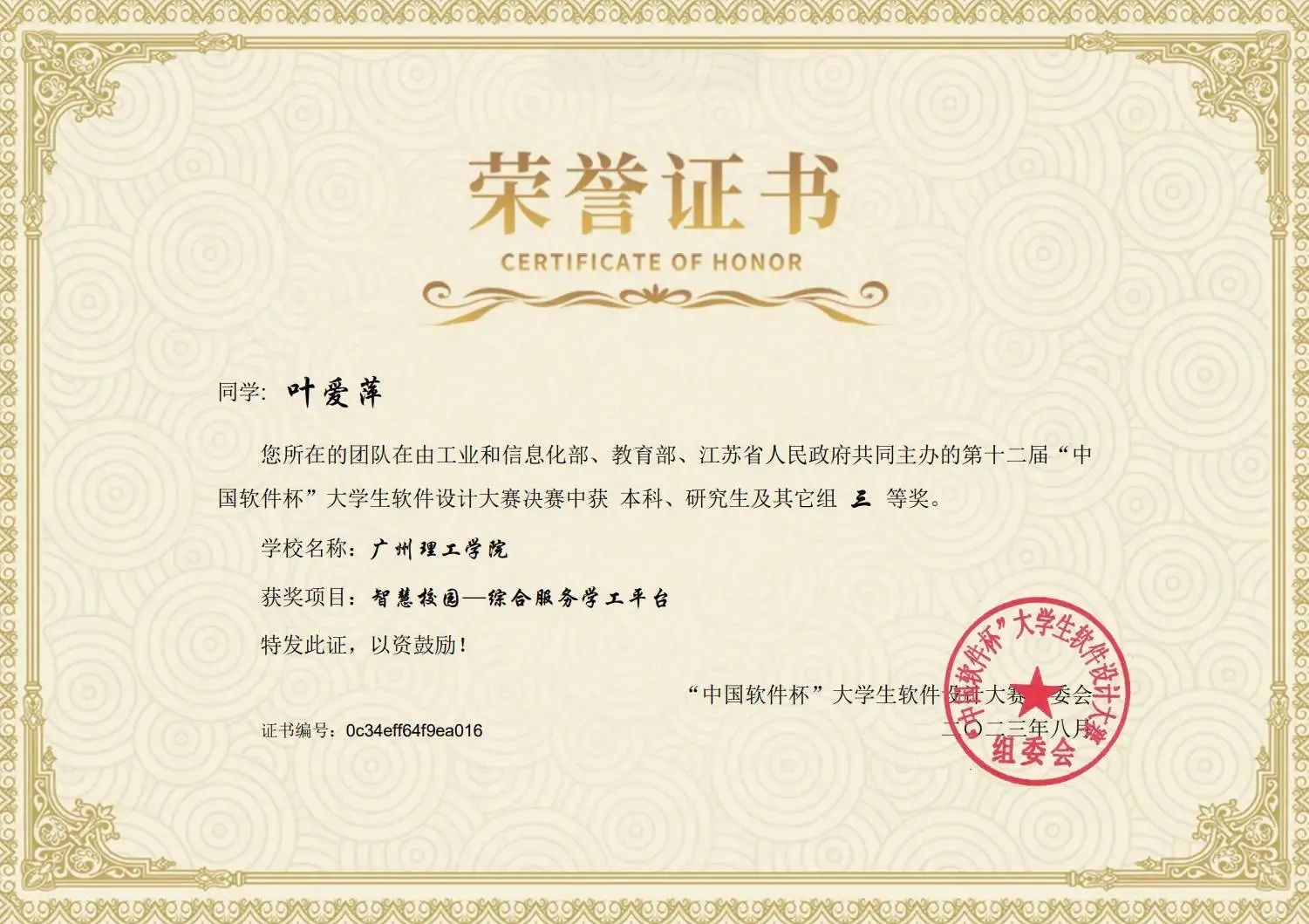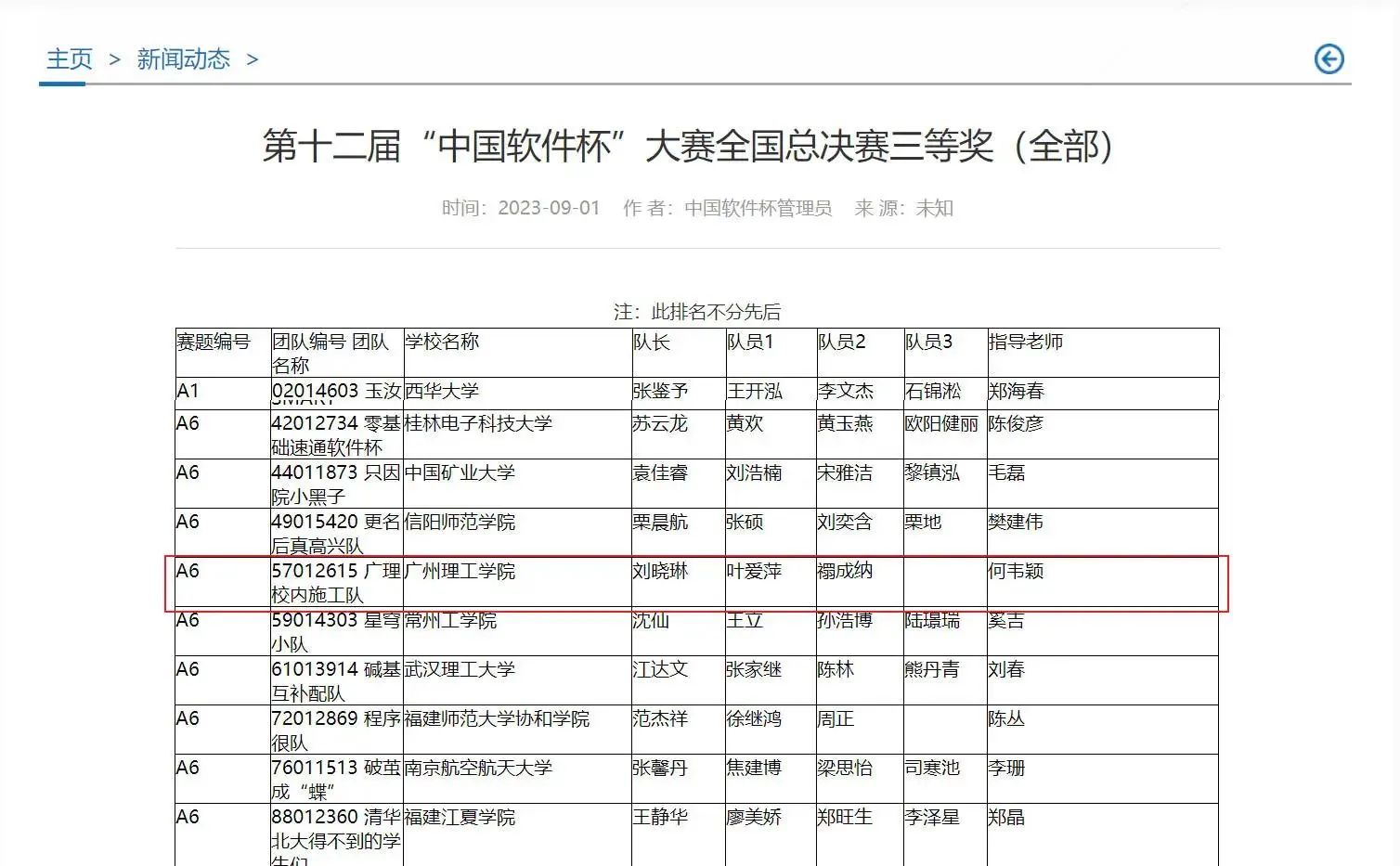 (通讯员:李风景 禤成纳)近日,第十二届“中国软件杯”大赛全国总决赛获奖名单终于揭晓,太阳成集团tyc122ccvip天软科技工作室何韦颖和周文剑老师指导的,由20级计科专业的刘晓琳、叶爱萍、禤成纳三位同学组成的“广理校内施工队”获得了A类赛事国家级三等奖!