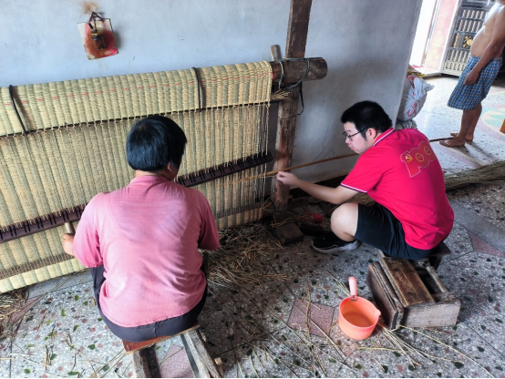 草席文化曾为曲塘村的重要文化构成部分,突击队队员们有幸得到了民间手工艺人的悉心指导,深入了解到草席编织的整个流程以及所需的原材料与各种特性等方面的知识,还在村民的带领下,动手体验草席制作过程。在体验过程中,让队员们感受颇深的是,草席看似是简单的手工制品,然而其中主要的穿草和扣紧的过程并不容易。此过程不仅要求具备熟练的制作技巧,还需手艺人之间默契配合,不断重复这看似枯燥却至关重要的穿草和扣紧环节。