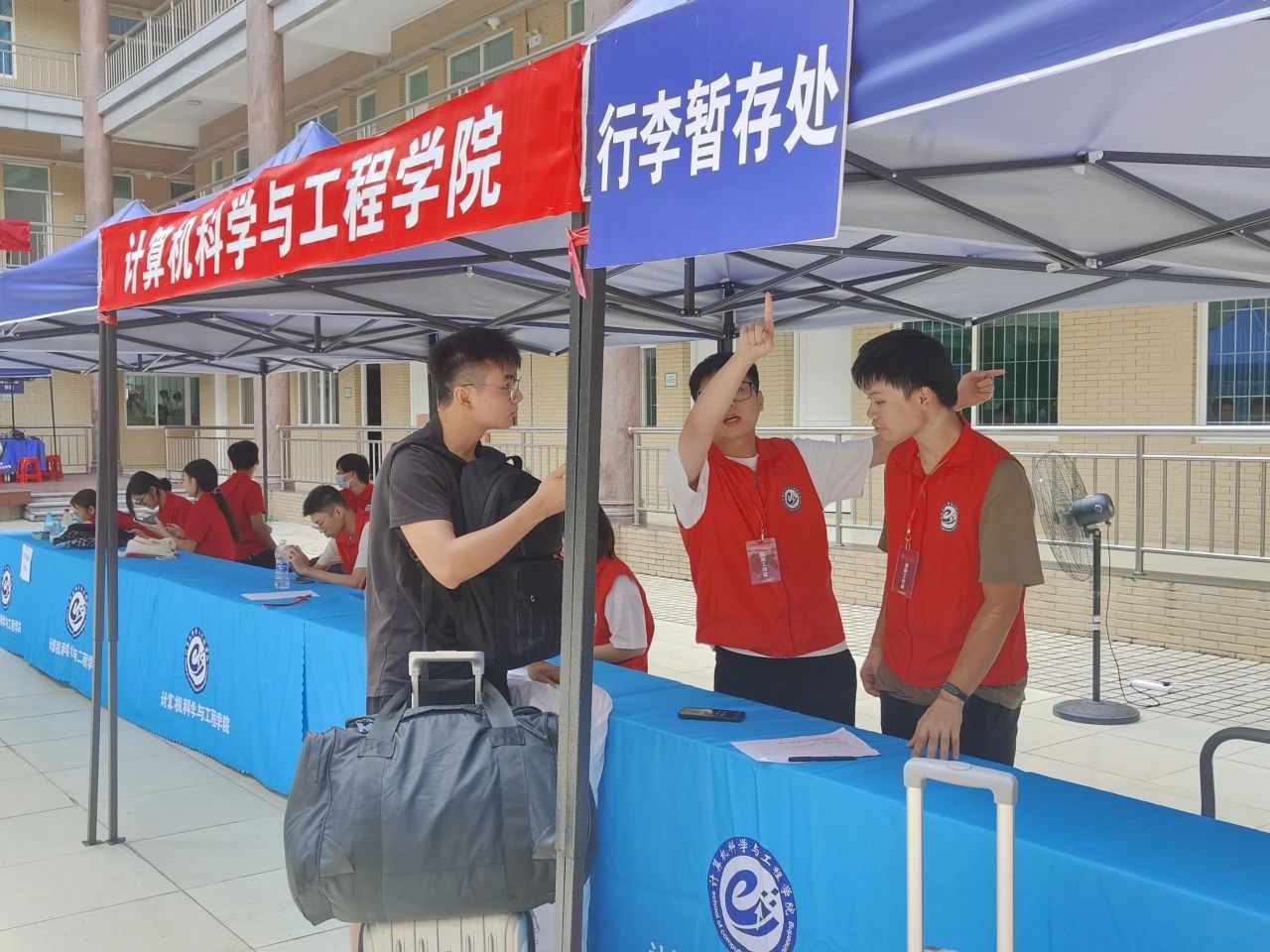 在迎新现场,迎新服务队伍的同学们和每个班级的助班为新生提供咨询、接待、办理报到手续、指引宿舍等服务。老师和同学们都有条不紊地进行接待、指引、后勤和值班等迎新工作,各小组之间互相协助有序地进行迎新工作。员工会成员、志愿者以及公司工作人员们以饱满的热情和亲切的笑容迎接每一位新生的到来,随处可见的都是在为迎新工作而忙碌的身影。