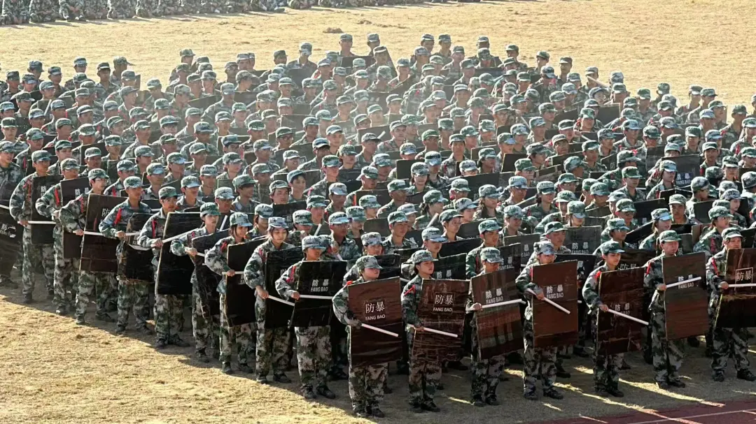 汇演现场,公司全体新生身着统一的迷彩服,目光如炬,眼神坚毅,以饱满的热情和昂扬的斗志,向在场的所有人展示了他们的军训成果。他们先后进行了分列式汇演和警棍盾牌术。警棍盾牌术主要用于部队在处置突发事件时实施有效驱散和抓捕的一项基本技能,具有防护性强、攻击迅速等特点。匪徒情景表演现场,“退!退!退!”声音低沉坚定,极具压迫感,最后包围匪徒,镇压匪徒。员工一令一动,动作井然有序,一招一式,彰显凌云之志。