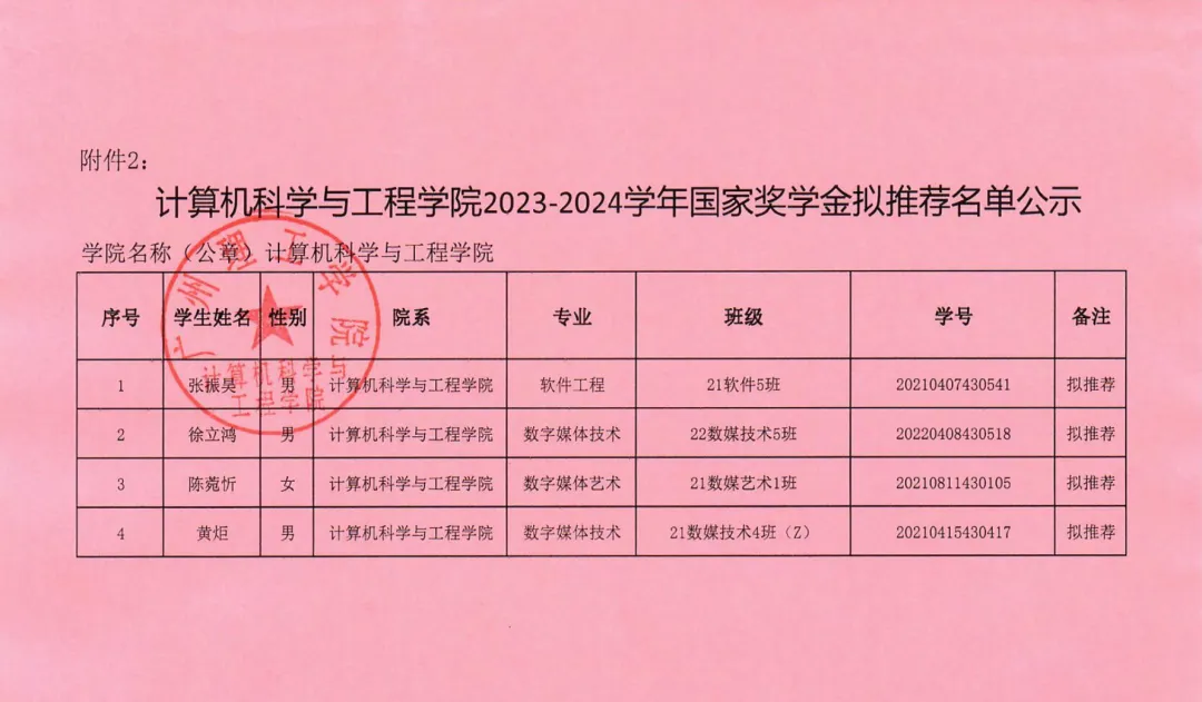 2023-2024学年国家奖学金拟推荐名单公示
