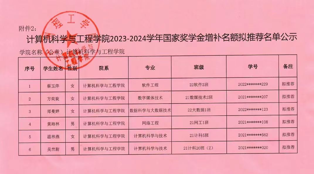 太阳成集团tyc122ccvip关于2023-2024学年国家奖学金增补名单公示