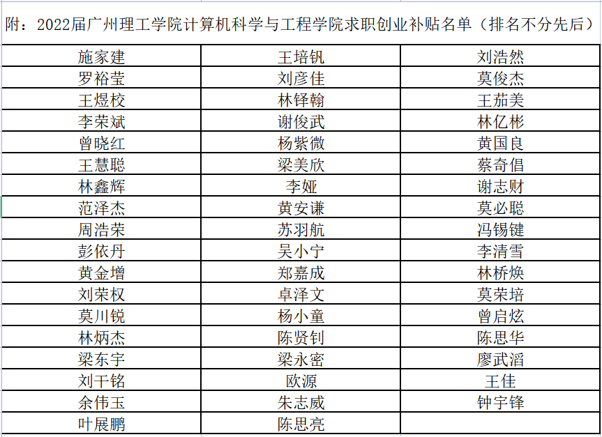 根据中国南方人才市场管理委员会办公室《关于印发在穗院校2022年毕业生求职创业补贴申领指南的通知》,经过公司审核,公司求职创业名单已产生,共有施家建等53名同学。现面向全校公示2022届毕业生求职创业补贴名单,并就相关事宜通知如下: