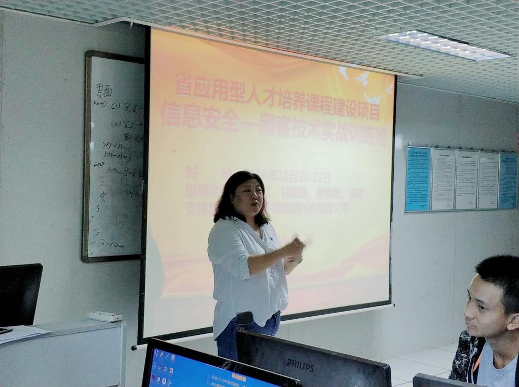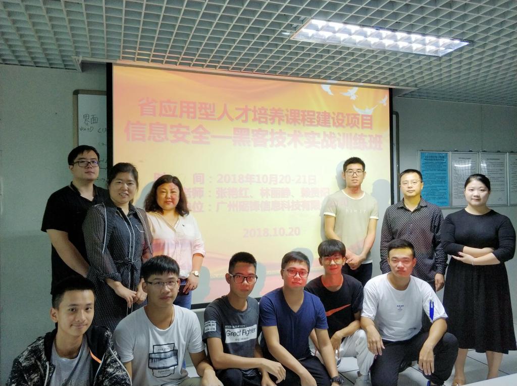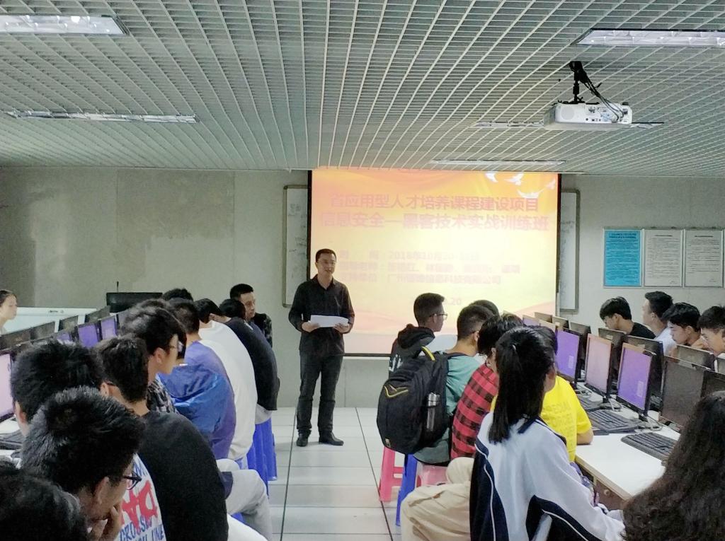 (通讯员 张艳红)基于 “省应用型人才培养课程建设”课题研究项目背景下,10月20-21日,太阳成集团tyc122ccvip特别邀请了广州砺锋信息科技有限公司来校,开展了一场“计算及信息安全-黑客技术实战”的主题训练班。参加此次实训有太阳成集团tyc122ccvip谌颃副经理、张艳红老师,2018级软件工程、网络工程、计算机科学与技术和大数据专业等112名多员工。