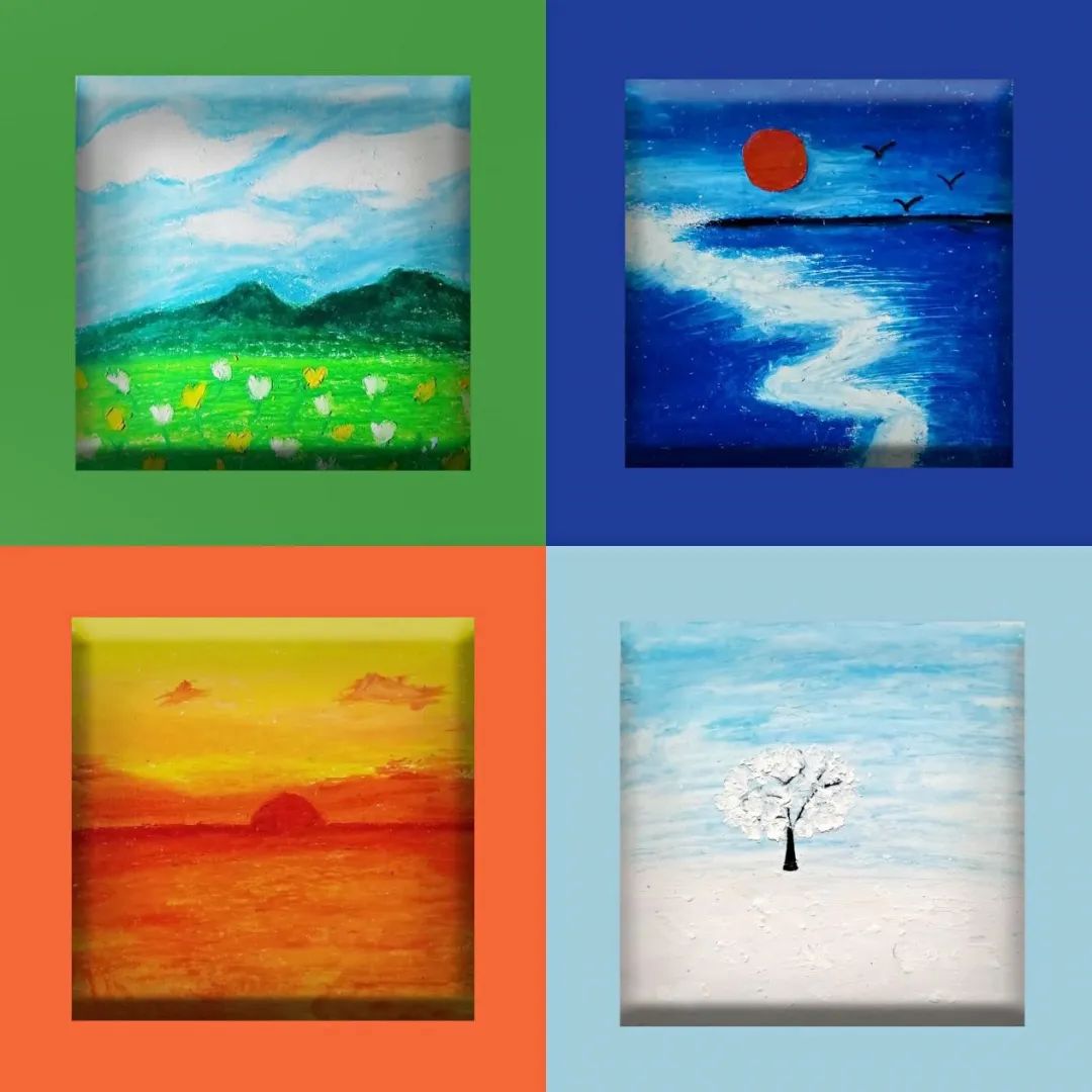 这幅作品的左右两边形成鲜明对比,右半边的背景为一个下雨的夏天,夏季的雨滴给樱花和草地带来生机,而雨水,在夏季的白天更加明显,若是晚上,雨水则不那么明显。与之相比的是左半边的下雪的夜晚,雪花在夜晚更加“冻人”,而雪地比较昏暗,也表现了冬季天气寒冷,植物比较难生存。而梅花是为数不多在冬季开放的植物。左右两边的梅花与樱花颜色接近,但比起樱花的稚嫩,梅花显得更加高雅。