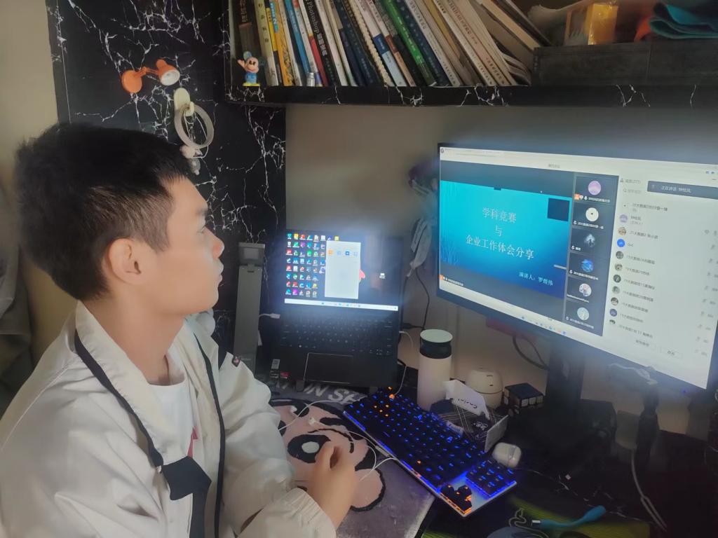 分享上,罗煜伟围绕“竞技双修和工作体验”进行分享。他先简单介绍大学的各类竞赛及目的,参加各类竞赛不仅可以转换学分、提升自身的能力、获得荣誉和奖金,更能在毕业后丰富简历,为进入社会奠定基石;随后分享他以前参加竞赛的思路,如何撰写竞赛论文以及注意事项;最后分享大数据专业的社会就业工作,实习面试所面临问题、职场与公司的不同以及注意的人际关系处理等。