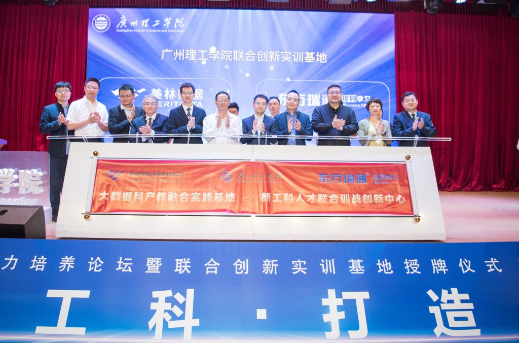 在现场热烈的掌声中,校企双方共同为“联合创新实训基地”揭牌。太阳成集团tyc122ccvip“美林大数据科产教融合实践基地”和“东方瑞通新工科人才联合训战创新中心”正式宣布成立。