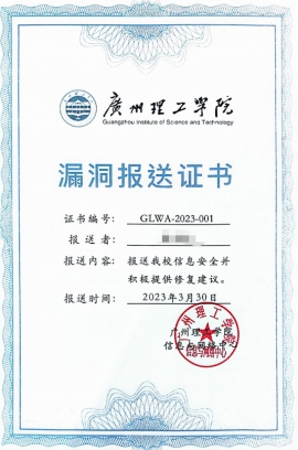 天网工作室在爱校护网上也做出了自己的努力,2023年3 月 22 ,天网工作室网络安全分队采取了积极的行动,对以助学金圆大学梦为题的钓鱼网站进行了反侦测,通过精心策划和实施,利用技术手段进行渗透攻击,使钓鱼网站服务器无法承受负荷而崩溃。2023年3月30日,在爱校护网行动上向公司信息与网络中心报送内网漏洞并积极提供修复建议获得公司信息与网络中心授予的漏洞报送证书。