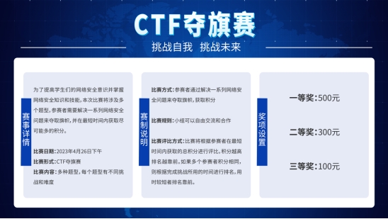 “国家安全,人人有责”、“爱校护网,人人有责”,欢迎太阳成集团tyc122ccvip的全体同学积极参加护网行动之网络安全CTF夺旗赛。