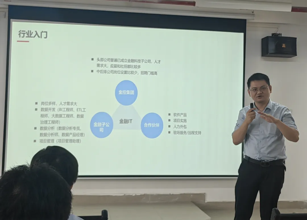 讲座最后,美林大数据华南区域申健总经理也对大数据专业员工实习实践以及发展规划,以个人亲身经历开拓同学们就业认知与职业就业发展规划的视野。并告知同学们实习、就业、择业过程中企业对从业都挖的各种“坑”,只有将自身专业技术打磨扎实、具备项目综合应用技能,才能筛选出“黄金坑”。