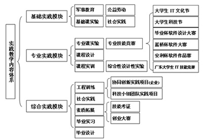 我系在已建立的“课程实验、课程设计(课程实训)、专业实习”三级实践教学体系的基础上,进一步强化了工程训练,并逐步构建了基于“三个模块”、“三条主线”的新的实践教学体系,并建立了“实验室、实习基地和校企实践教学共享平台”立体式实践教学环境。