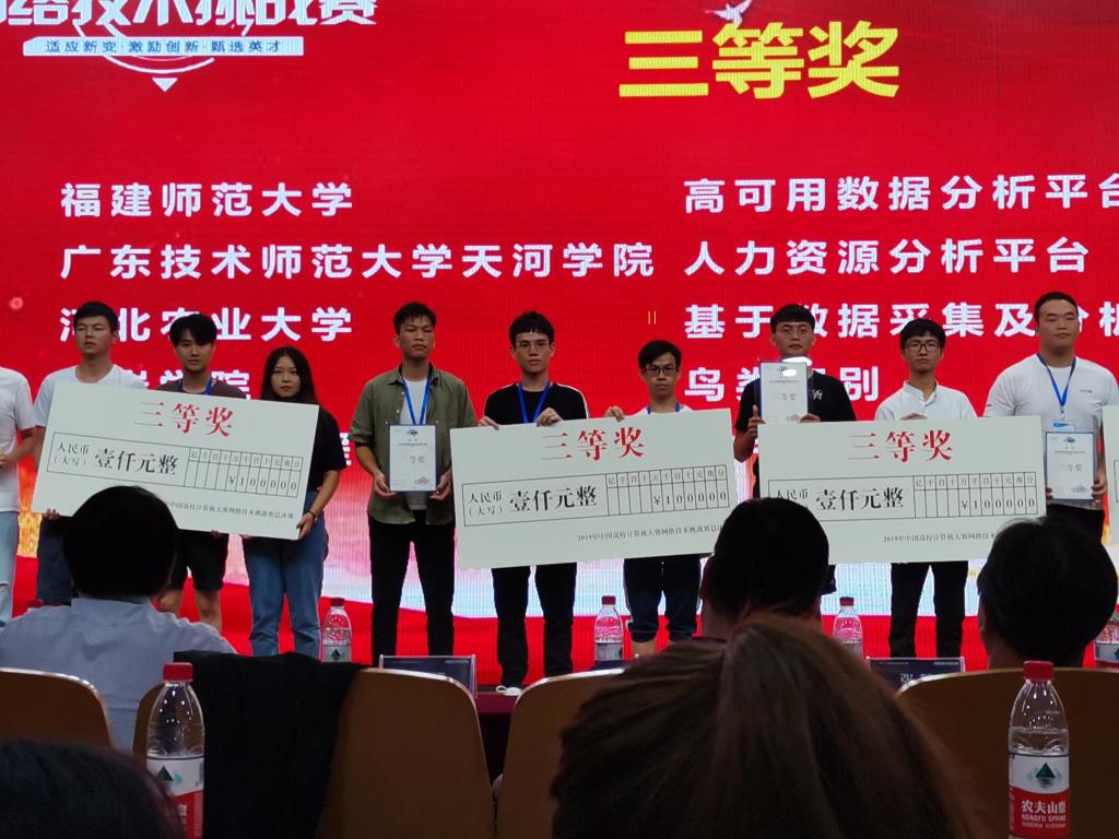 比赛分为区域赛与总决赛。经过大家的努力,公司员工在前期华南区域赛中有10组同学参加,有7组同学取得了不错成绩,分别获得一等奖1项、二等奖3项、三等奖3项。从区域赛中脱颖而出的前2组同学晋级国赛。最终,由王金恒、田桂丰老师指导的16级网工班尤浩光、马鸿辉、谭振宇三位同学所在小组,由陈易平、王煜林老师指导的16级网工班吴木胜、李才森、陈敏标、蔡芷源四位同学所在小组获得了全国总决赛三等奖。