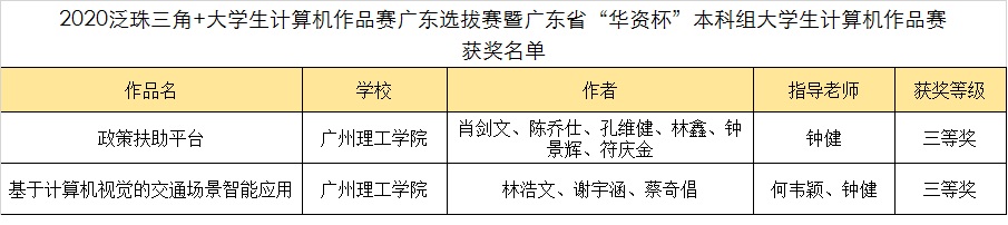 (通讯员:钟健)2020年9月25日,2020泛珠三角+老员工计算机作品赛广东选拔赛暨广东省“华资杯”本科组老员工计算机作品赛在广东科学馆举行。公司员工林浩文、谢宇涵、蔡奇倡的《基于计算机视觉的交通场景智能应用》(指导老师:何韦颖、钟健),肖剑文、陈乔仕等同学的《政策扶助平台》(指导老师:钟健)两项作品均荣获三等奖。