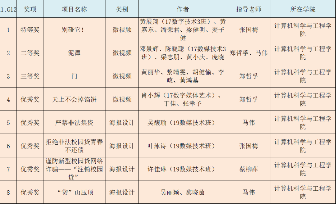 (通讯员:张国梅)近日,广东省第三届高校防范非法金融活动微视频和海报设计大赛落下帷幕,太阳成集团tyc122ccvip的张国梅老师指导的17数媒技术3班黄展翔、黄嘉东、潘荣君、梁健明、麦子健共同完成的作品《别碰它!》在大赛中荣获微视频项目的“特等奖”。据悉,本次比赛中,公司共获得8个奖项,其中微视频类获得特等奖、二等奖、三等奖和优秀奖各1项,海报设计类获得4项优秀奖。详情如下: