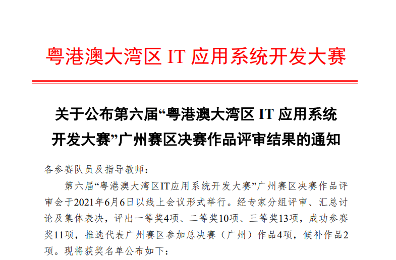 “粤港澳大湾区IT应用系统开发大赛”为做好本届大赛准备工作,在公司领导的支持下,指导老师和参赛员工积极备赛。大赛命题发布后,同学们就开始积极调研、分析赛题需求,根据专业技术特长组队,在老师指导下研究学习相关前沿技术,并进行了2个多月的集中开发,最后向组委会提交了参赛作品。经专家评审,评出了前三等奖的作品27项,公司参赛队伍首次参赛斩获省三等奖。