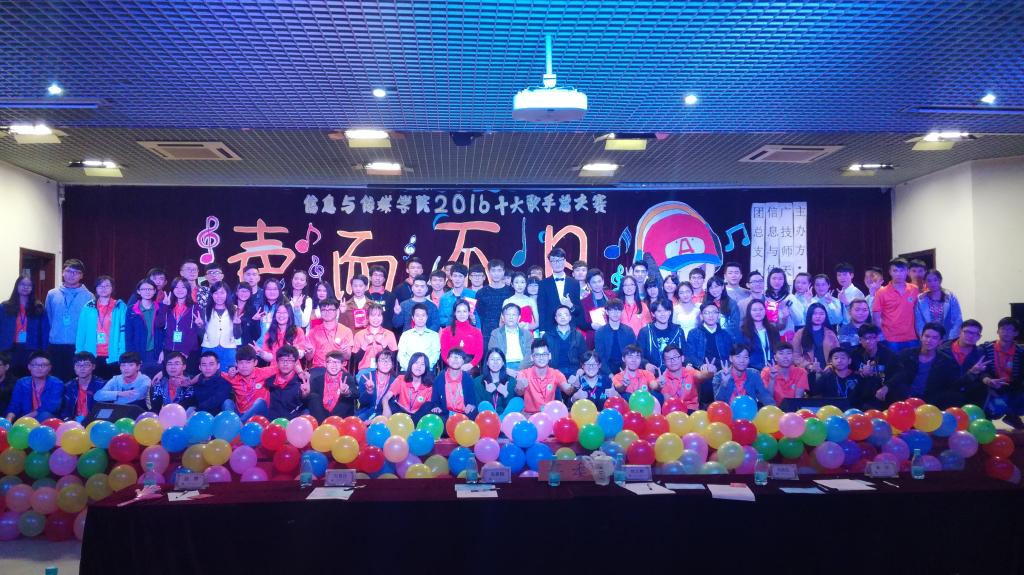 12月2日,信息与传媒公司“声而不凡”十大歌手决赛在学术报告大厅隆重举行。本次决赛的评委有2013年校园十大歌手总冠军张嘉桐师姐、2013年校园十大歌手郑文辉师兄、2014年校园十大歌手刘桂妃师姐、2014年艺术公司十大歌手林拓师兄、2014年管理公司十大歌手石育臣师兄、2015年校园十大歌手赵鹏师兄等。并邀请信息与传媒公司党总支袁颂皎书记、谌颃副经理、团总支杨柳书记以及辅导员黄鸿鑫老师作为本次大赛的嘉宾。