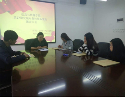 2016年12月21日,信息与传媒公司员工党支部在在教师会议室召开了第二十七期预备党员通表大会。本次会议由邱焕飞等10名同志提出了申请,会议由院员工党支部组织委员吴炯俊主持,出席此次会议的有全体员工党员和10名发展对象。