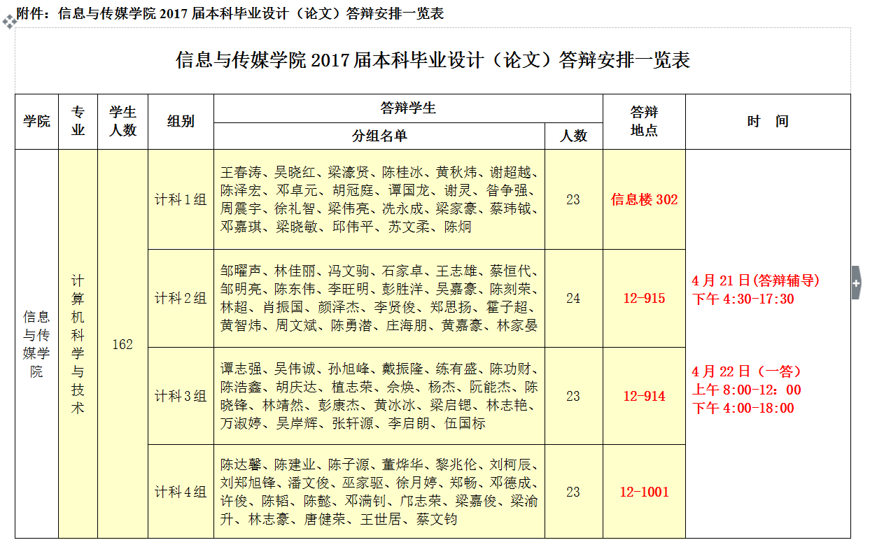 附件:信息与传媒公司2017届本科毕业设计(论文)答辩安排一览表(见下页)