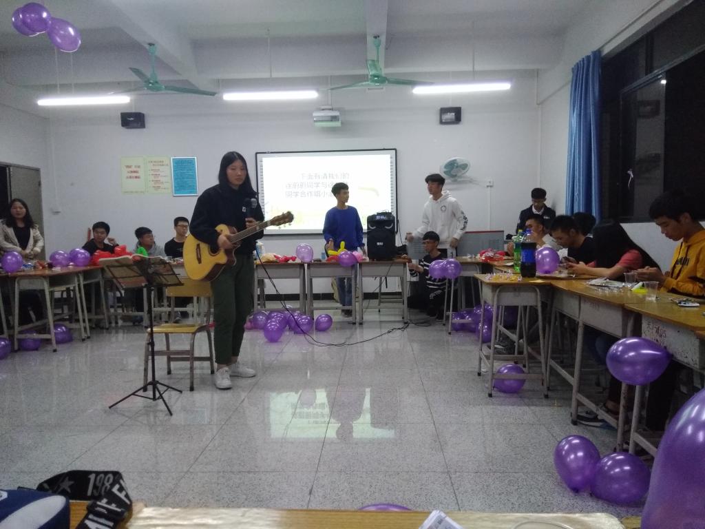 班长林歆润精心策划筹备了本次主题班会,还特别邀请了助班黄贵丽和部分师兄师姐们一起参加。班会由吴兆镒同学主持,首先由班内“Rap小王子”称号蔡健的表演说唱拉开了班会的序幕。然后到各个宿舍为单位的展示时间,其中,徐怡然与徐蔚蔚演唱的《小酒窝》、101宿舍合唱的《鸽子》以及谢俊武同学演唱的《月半小夜曲》让全场沸腾起来。然后,主持人组织让同学们分组一起玩了“有口难言”游戏。助理班主任黄贵丽也被这氛围感染,主动演唱了一首《慢慢喜欢你》,感动了全场。