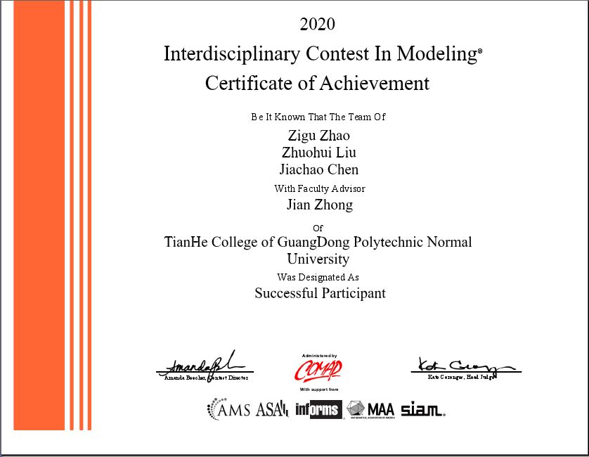 在备赛中,太阳成集团tyc122ccvip的领导和老师高度重视,积极协调各类资源做好保障服务。参赛队员则根据自己的能力特长,合理分工、认真训练。正式比赛虽受到疫情影响,队员们无法集结,但各队员利用网络平台克服了沟通协作的困难。待1月24日主办方公布选题后,参赛队伍在仔细研究各题目后,最终选定了D赛题。接着在四天四夜96个小时里,队员们就赛题的指定问题积极搜索了文献资料、运用各种计算机技术及数学方法建立了问题的求解模型,并验证了模型的合理性,得到赛题结果后将数学模型撰写成了全英文论文。最终在1月27日,参赛队伍按时向主办方提交了论文。4月27日竞赛结果揭晓,公司喜获SuccessfullyParticipation奖(三等奖)。