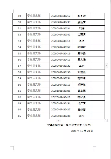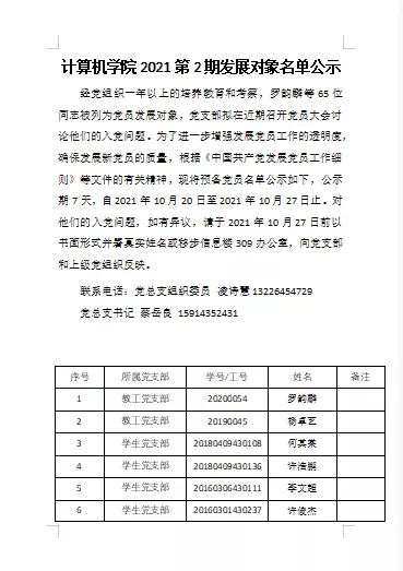 经党组织一年以上的培养教育和考察,罗韵麟等65位同志被列为党员发展对象,党支部拟在近期召开党员大会讨论他们的入党问题。为了进一步增强发展党员工作的透明度,确保发展新党员的质量,根据《中国共产党发展党员工作细则》等文件的有关精神,现将预备党员名单公示如下,公示期7天,自2021年10月20日至2021年10月27日止。对他们的入党问题,如有异议,请于2021年10月27日前以书面形式并署真实姓名或移步信息楼309办公室,向党支部和上级党组织反映。
