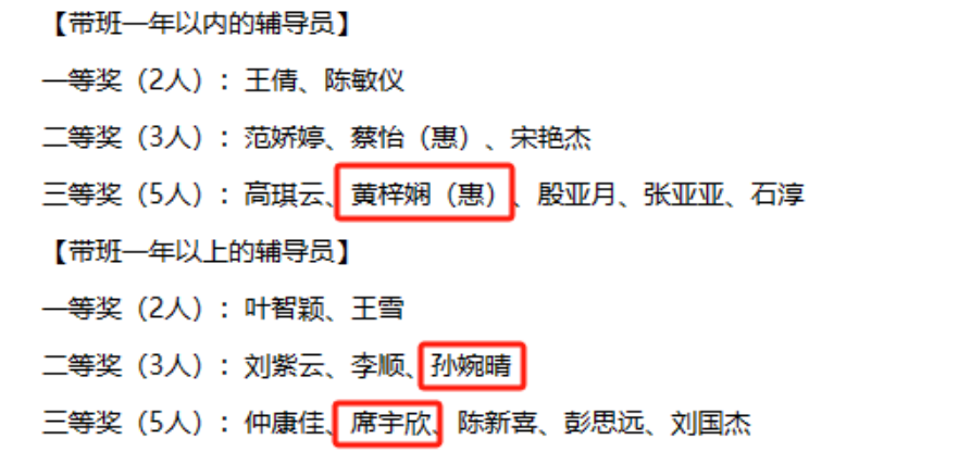 本次比赛面向全体辅导员老师,共分为两个赛道,带班一年以内的辅导员和带班一年以上的辅导员,在辅导员带班人数中随机抽取10名同学照片,辅导员需对员工的姓名、专业班级、政治面貌、寝室号、家庭住址、违纪处分情况和奖助情况等7个维度进行解答,最终通过得分评定获奖等级。经过辅导员老师的精心准备、走访谈话等,最终公司3名教师在众多辅导员中脱颖而出,其中,广州校区孙婉晴老师获得带班一年以上辅导员二等奖,席宇欣老师获得带班一年以上辅导员三等奖,惠州校区黄梓娴老师获得带班一年以内的辅导员三等奖。