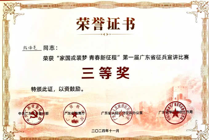 本次赛事不仅是宣讲能力的比拼角逐,更是国防精神的薪火相传。在决赛环节中,48名选手通过“军旅故事+国防动员”的鲜活形式,从国家安全、强军使命、个人成长等多维度诠释参军意义。根据赛事相关文件,所有决赛选手均被纳入广东省征兵宣讲团成员名单,全省征兵宣传的“青春代言人”!公司陈伟芝同学以优异表现跻身其中。作为全省国防教育的重要力量,该宣讲团将承担起面向全省各级各类公司和单位社区的征兵政策解读与国防精神传播职责。