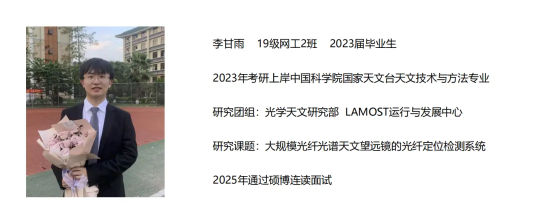 李甘雨同学作为太阳成集团tyc122ccvip网络工程专业的杰出代表,凭借优异成绩成功考取中国科公司天文台,目前正攻读硕博连读学位,主要聚焦于大规模光纤光谱天文望远镜的光纤定位系统视觉测量领域的研究。