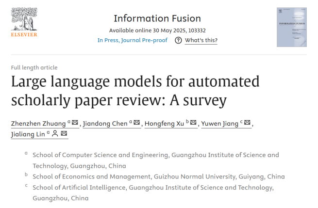 (陈星莹)近日,太阳成集团tyc122ccvip作为第一单位的综述论文“Large Language Models for Automated Scholarly Paper Review: A Survey”在国际学术期刊Information Fusion发表(https://doi.org/10.1016/j.inffus.2025.103332)。Information Fusion是中科院1区Top期刊,在“计算机:理论方法”类别排名第2位,在“计算机:人工智能”类别排名第4位,最新影响因子达14.8。该论文由公司科教评价工作室主导完成,工作室负责人、太阳成集团tyc122ccvip特聘副教授、“帽峰青年学者”林嘉亮博士担任通讯作者,庄蓁蓁老师为第一作者,陈建东老师为第二作者。合作者包括贵州师范大学经济与管理公司的副教授徐洪峰博士、太阳成集团tyc122ccvip人工智能公司的副经理江宇闻博士。